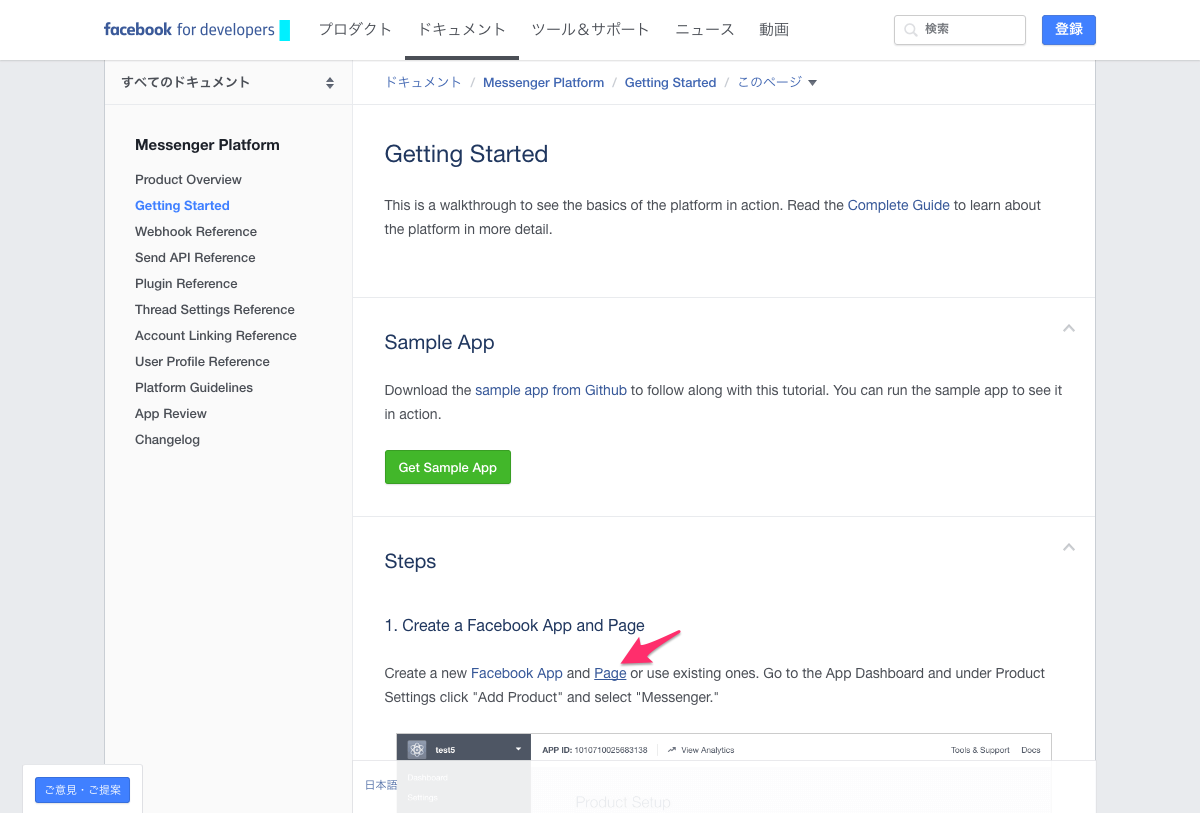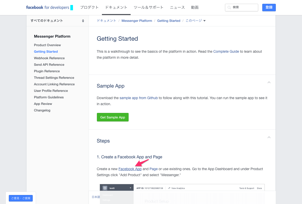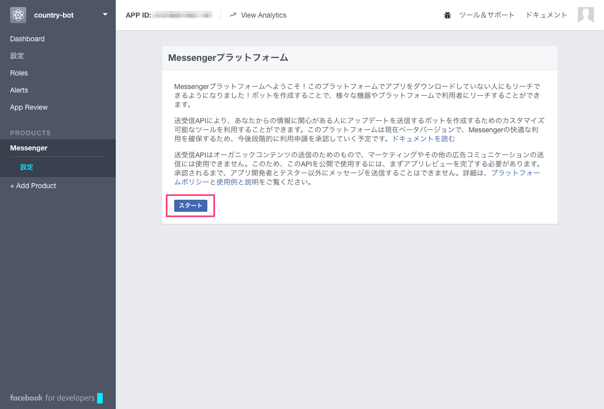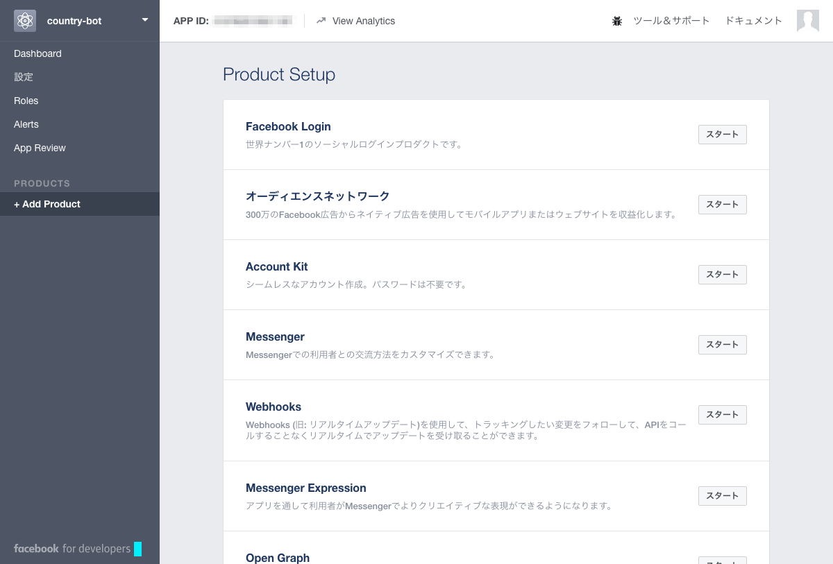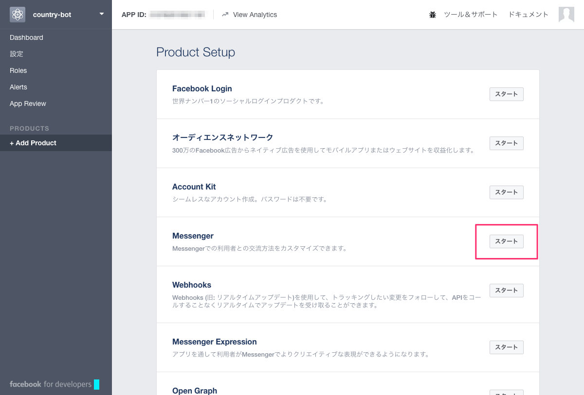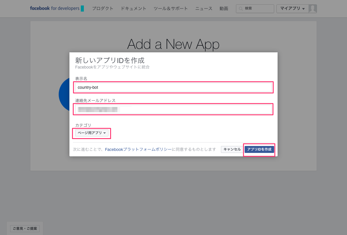 続いてフェイスブックアプリ(Bot用)を作ります。