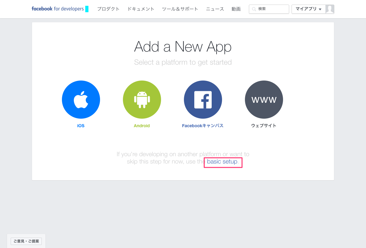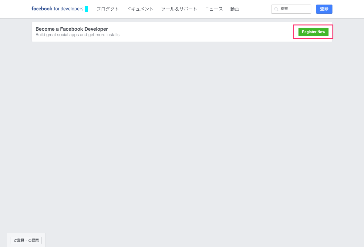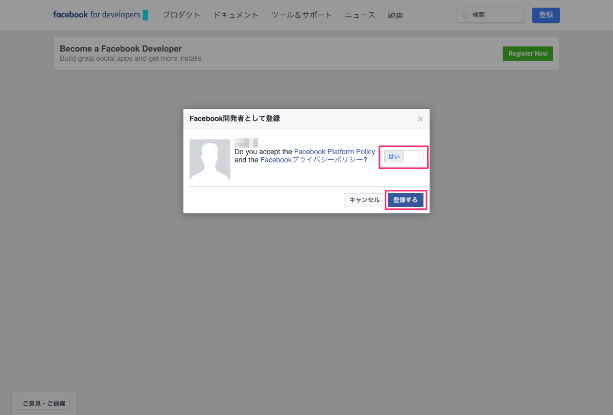 開発者登録を行なっていない場合、Facebookの開発者登録してよって言われるので