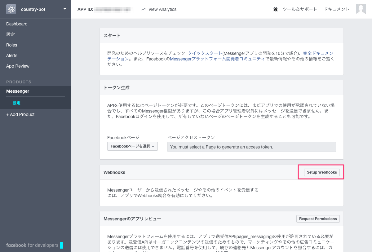 上記の3.Webhooks設定で定めたコールバックURLは、 https://xxxxx.xxx:443/facebook_messenger_bot とします。