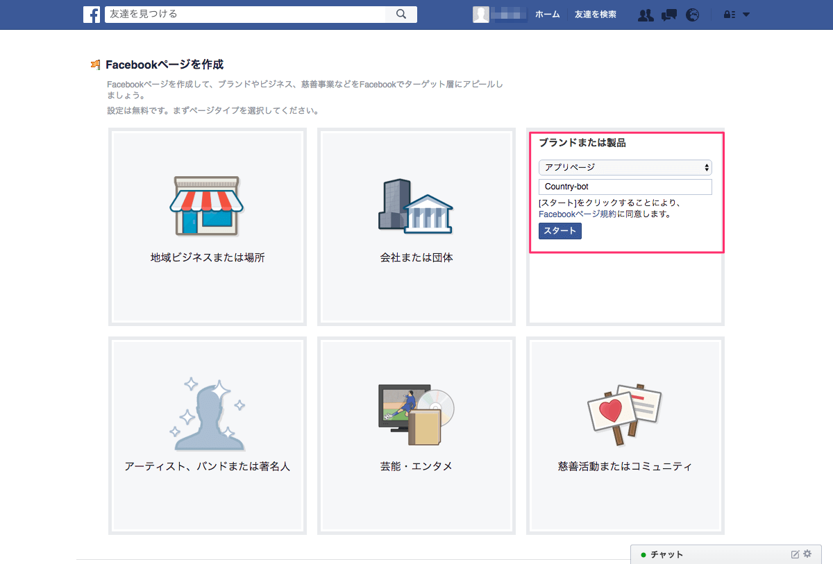 Facebookページを作成画面から右上のブランドまたは製品を選びます。上部のプルダウンからアプリページを選択、ブランドまたは製品名欄に任意のアプリ名(アルファベットの場合、先頭を大文字にしないと怒られる)を入れます。そして