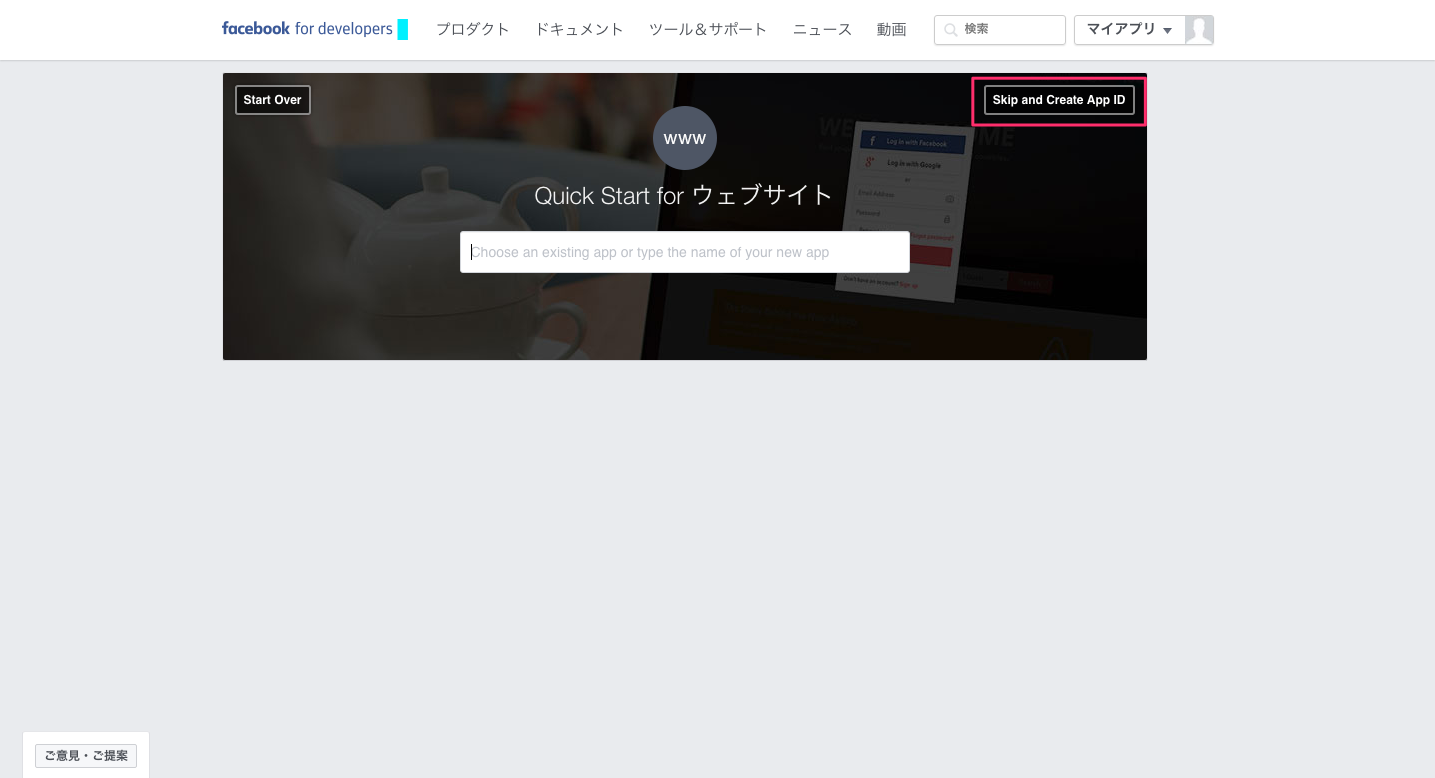 開発者登録を既にしている場合、Getting Started – Messenger Platformから、Facebook Appをクリックすると以下の画面になるのでSkip and Create App IDをクリックします。そうすれば、新しいアプリIDを作成のフロートが立ち上がります。
